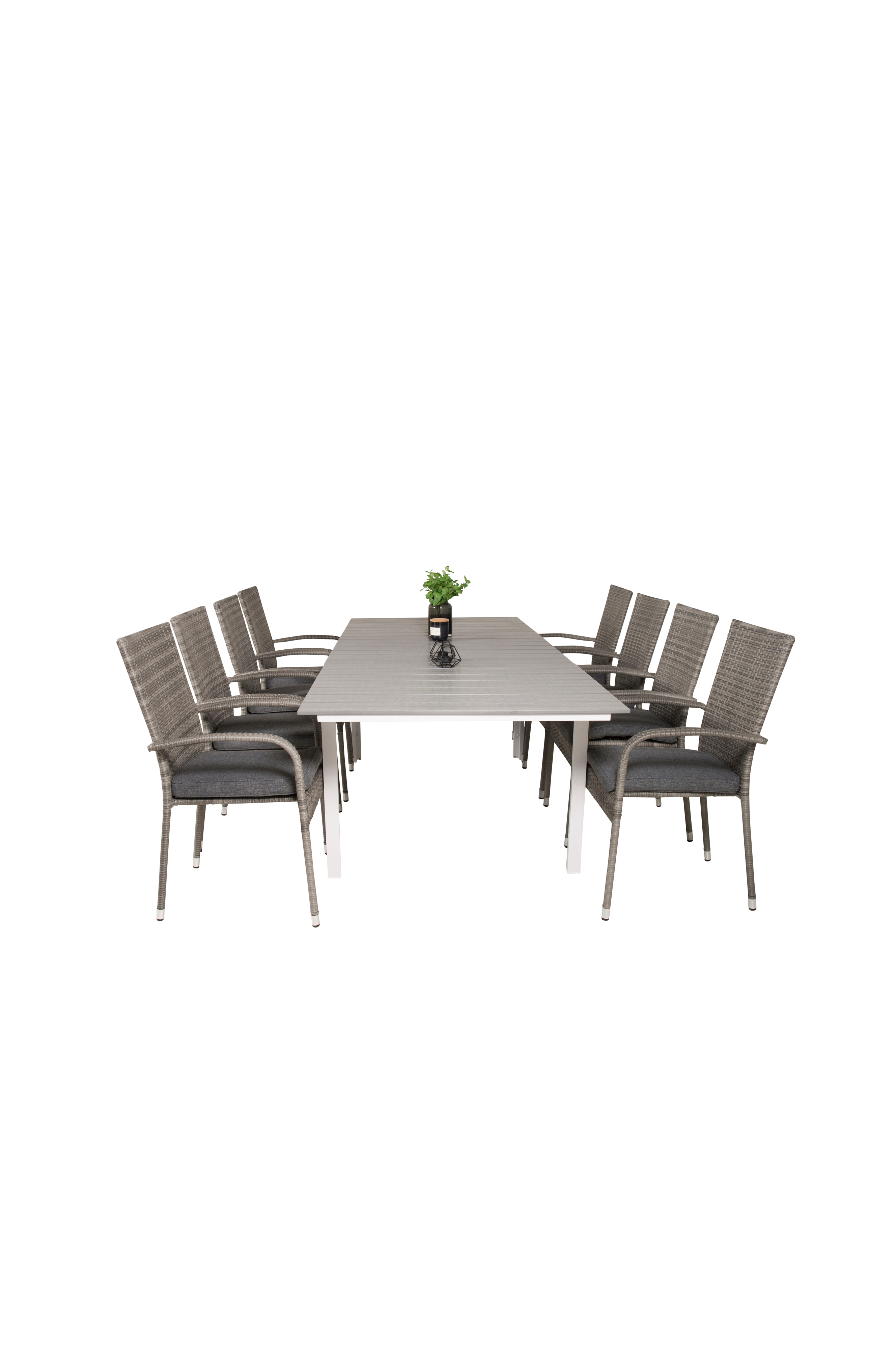 Louis spisebord med en farvet bordplade i aintwood og bordben i aluminium. Bordets mål: Længden kan forlænges mellem: 160 cm og 240 cm, Bredde: 100 cm, Højde: 75 cm. Matches med 8 stabelbare Astrid stole med stoleben i stål. Stolenes mål: Totalhøjde: 96 cm, Bredde: 45 cm, Dybde: 47 cm, Siddehøjde: 44 cm. Bord og stole kræver let montering.