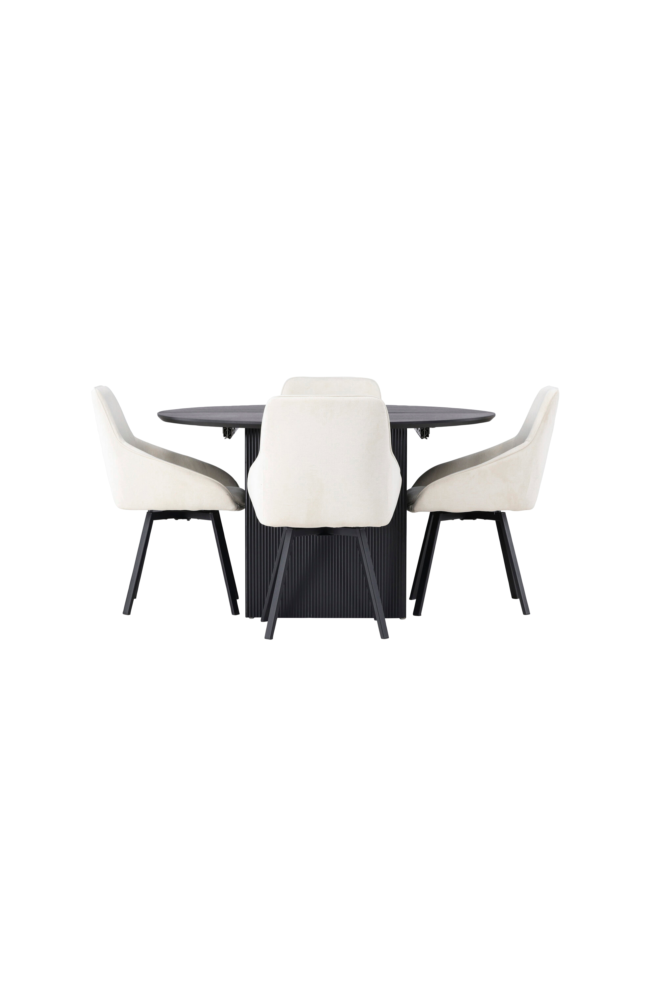 Det runde spisebord Matilda forvandler sig hurtigt til et ovalt bord ved hjælp af dets udtræksfunktion. Med en rund bordplade i MDF med finer og robuste, blokformede ben, tilføjer Matilda også et moderne og elegant touch til dit hjem. Her er spisebordet Matilda matchet med de skønne spisebordsstole Rosie. Disse stole i skandinavisk design har et fuldt betrukket sæde med integrerede stofarmlæn og let skrå stoleben i metal. Det bløde sæde er polstret for ekstra komfort, så du nemt kan nyde lange og behagelige middage.