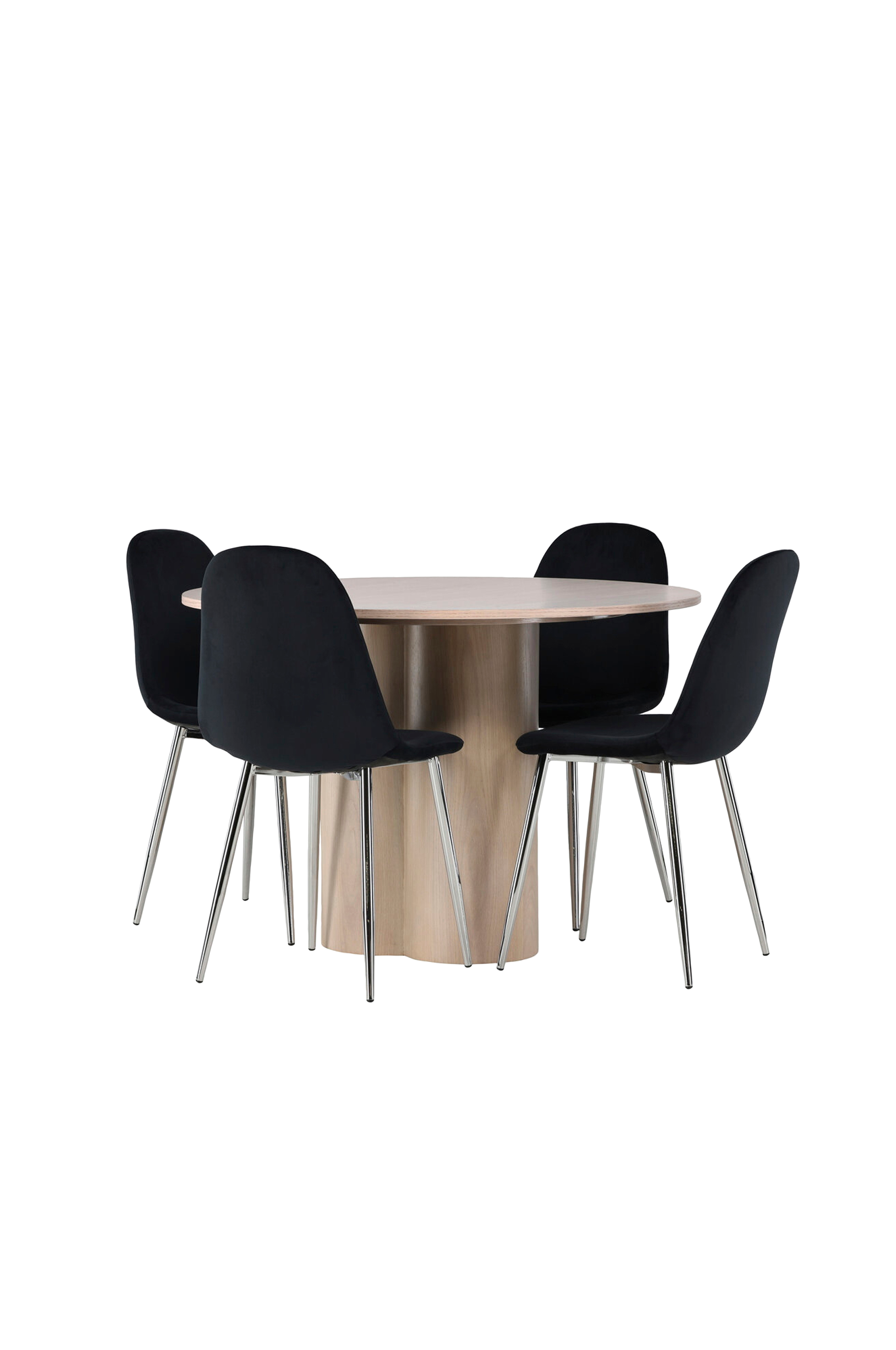 Det runde spisebord Olivia imponerer med sit skandinaviske design og smagfulde udformning. Med et gennemgående helhedsdesign i poleret MDF får du en perfekt kombination af stil og funktionalitet. De tre cylinderformede ben, samlet under midten af bordet, tilfører et moderne touch og skaber en stabil og robust base for bordet. Sammen med Olivia får du spisebordsstole fra Polar-serien, der tager din komfort til nye højder. Polar har et fuldpolstret design med ben i forkromet metal, som giver en flot detalje til helheden. Den let afrundede ryg og det bløde sæde i velourstof, skånsomt polstret for ekstra komfort, inviterer til lange og afslappede måltider.