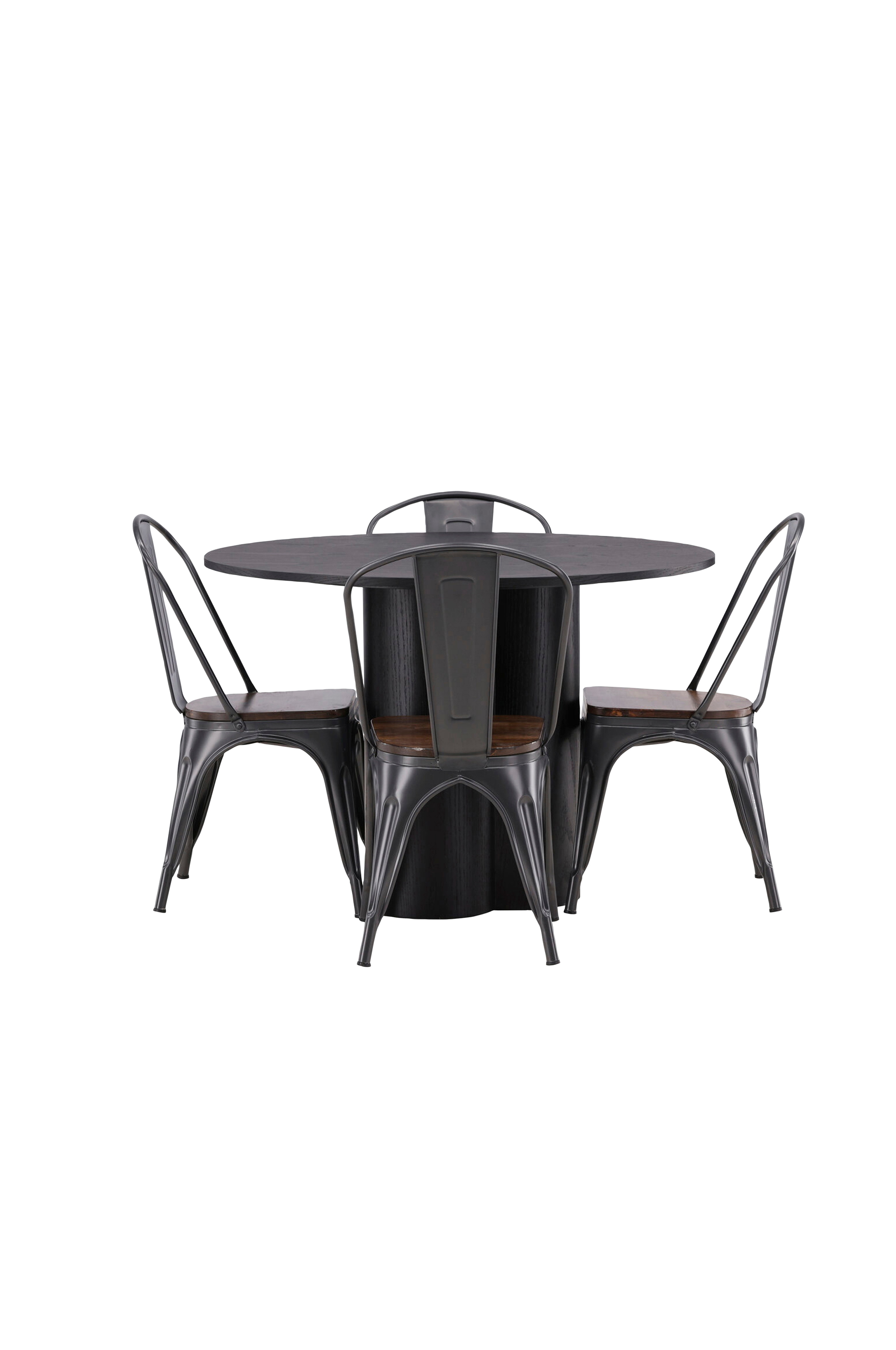 Indret stuen stilfuldt og moderne! Spisebord Olivia imponerer med sit skandinaviske design og smagfulde udformning. Bordet har et gennemgående helhedsdesign i MDF med en tynd, rund bordplade og tre cylinderformede ben, der sidder sammen under midten af bordet. Her sammen med stole fra serien Tempe i klassisk design. Stolene har let skrå ben som møder sædet og ryglænet i en stilsikker udformning, gennemgående fremstillet i sort metal. Sædet er i træ hvilket bliver en flot detalje. Nyd behagelige måltider fremover!