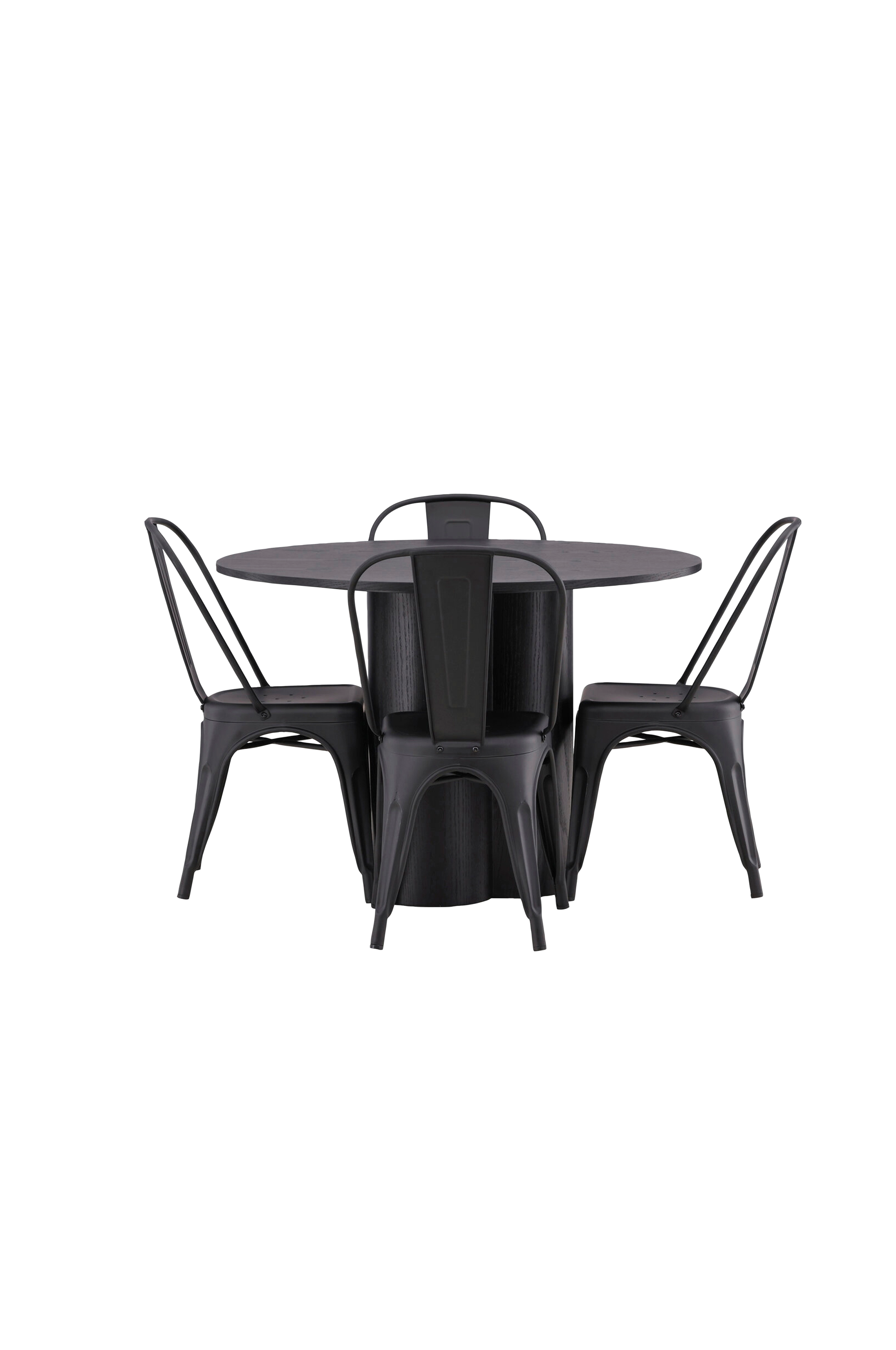 Indret stuen stilfuldt og moderne! Spisebord Olivia imponerer med sit skandinaviske design og smagfulde udformning. Bordet har et gennemgående helhedsdesign i MDF med en tynd, rund bordplade og tre cylinderformede ben, der sidder sammen under midten af bordet. Her sammen med stole fra serien Tempe i klassisk design. Stolene har let skrå ben som møder sædet og ryglænet i en stilsikker udformning, gennemgående fremstillet i sort metal. Sædet er i træ hvilket bliver en flot detalje. Nyd behagelige måltider fremover!