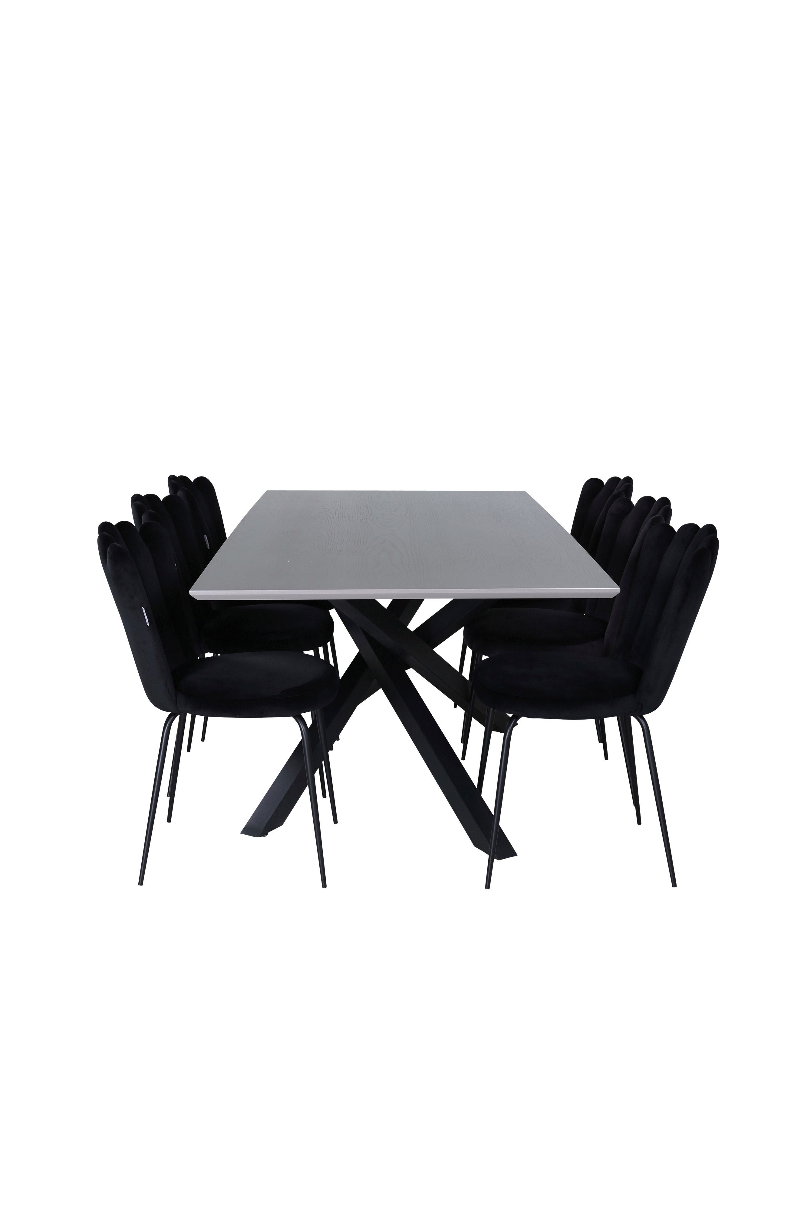 Piazza spisebord med en bordplade i MDF med finér og bordben i metal. Matches med 6 Limhamn Light spisebordsstole med sæde i velour og stoleben i metal. Bord og stole kræver let montering. Bordets mål: Længde: 190 cm, bredde: 90 cm, højde: 76 cm. Stolenes mål: Siddedybde: 41,5 cm, Siddebredde: 43 cm, siddehøjde: 48 cm.