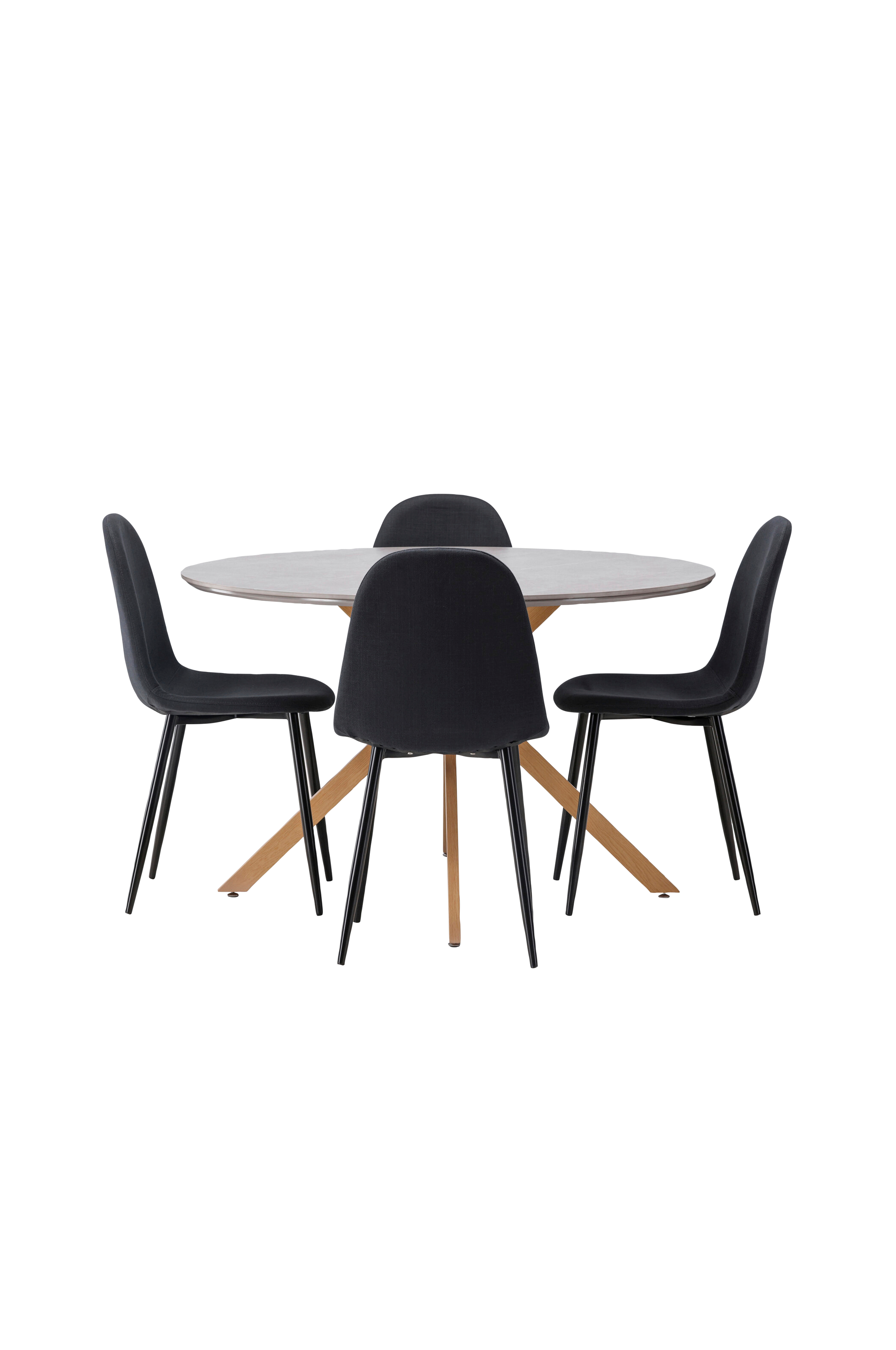 polar stolene er designet til optimal komfort med deres polyesterbetræk og robuste stålben. Stolenes sorte farve skaber en stilfuld kontrast til det grå bord. Hver stol er designet til at give en behagelig siddeoplevelse under lange måltider og samtaler.
