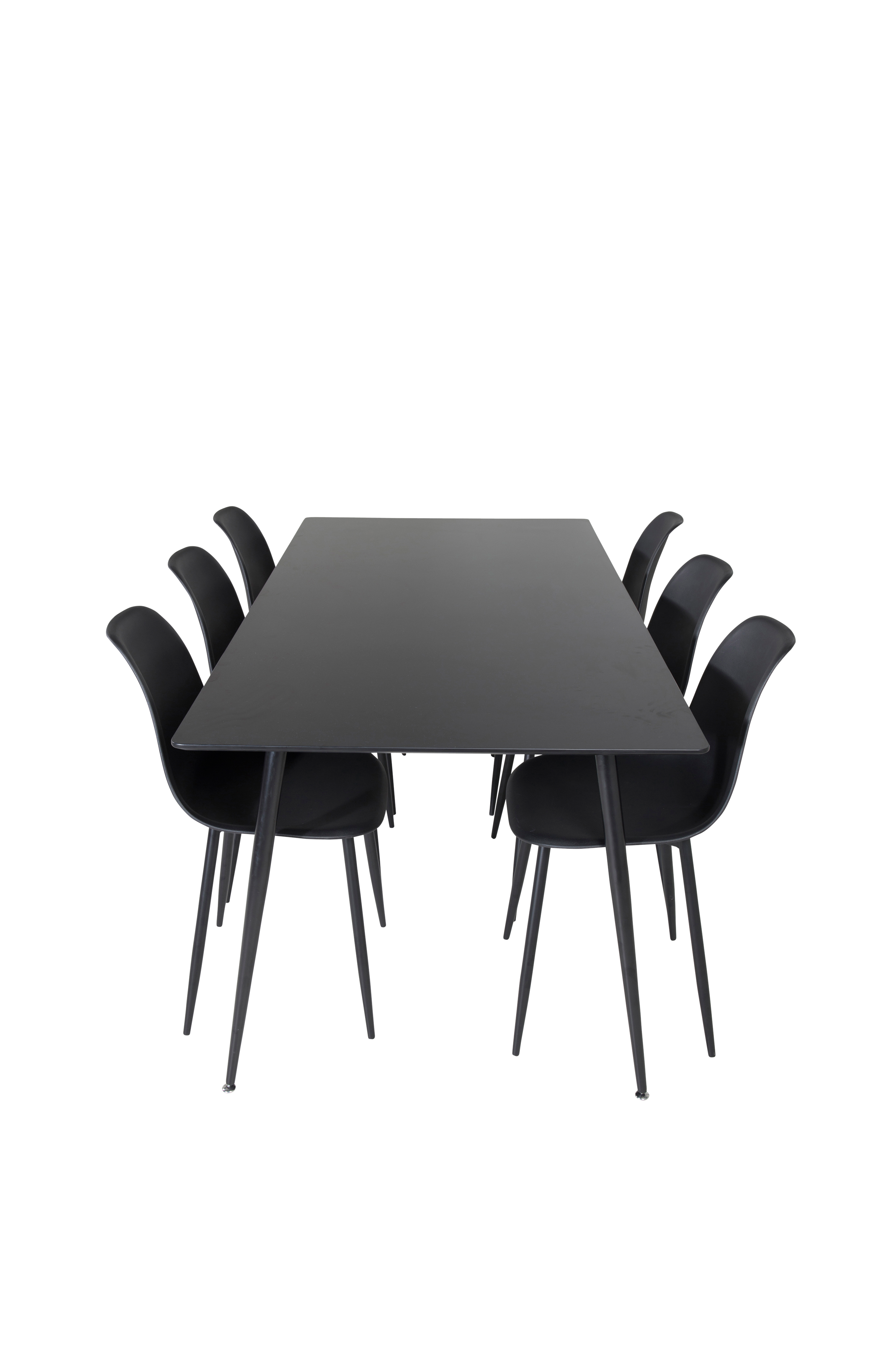 Solhem spisebord med en bordplade i MDF og bordben i metal. Matches med 6 Penally spisebordsstole med sæde i plast og stoleben i metal. Bord og stole kræver let montering.