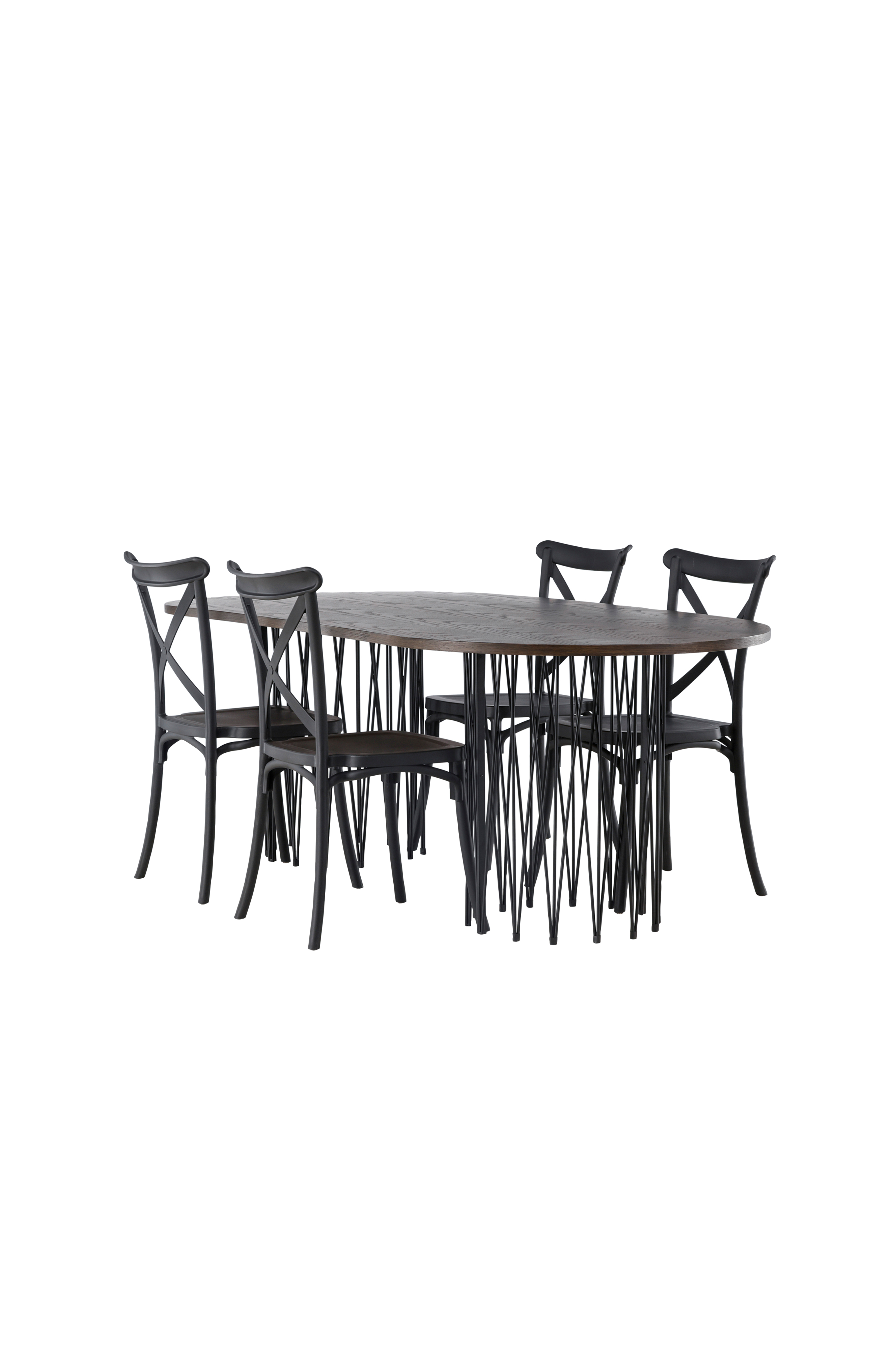 Indret stilfuldt! Det ovale spisebord Stone imponerer med sit modebevidste design. Bordet har en smuk bordplade i MDF med finér og to dekorative cylinderformede stel i metal. Her sammen med spisebordsstole fra serien Crosett. Stolen er helt lavet af det praktiske materiale plastik, der holder til tidens tand. Sæt tonen i stuen med en personlig spisegruppe!