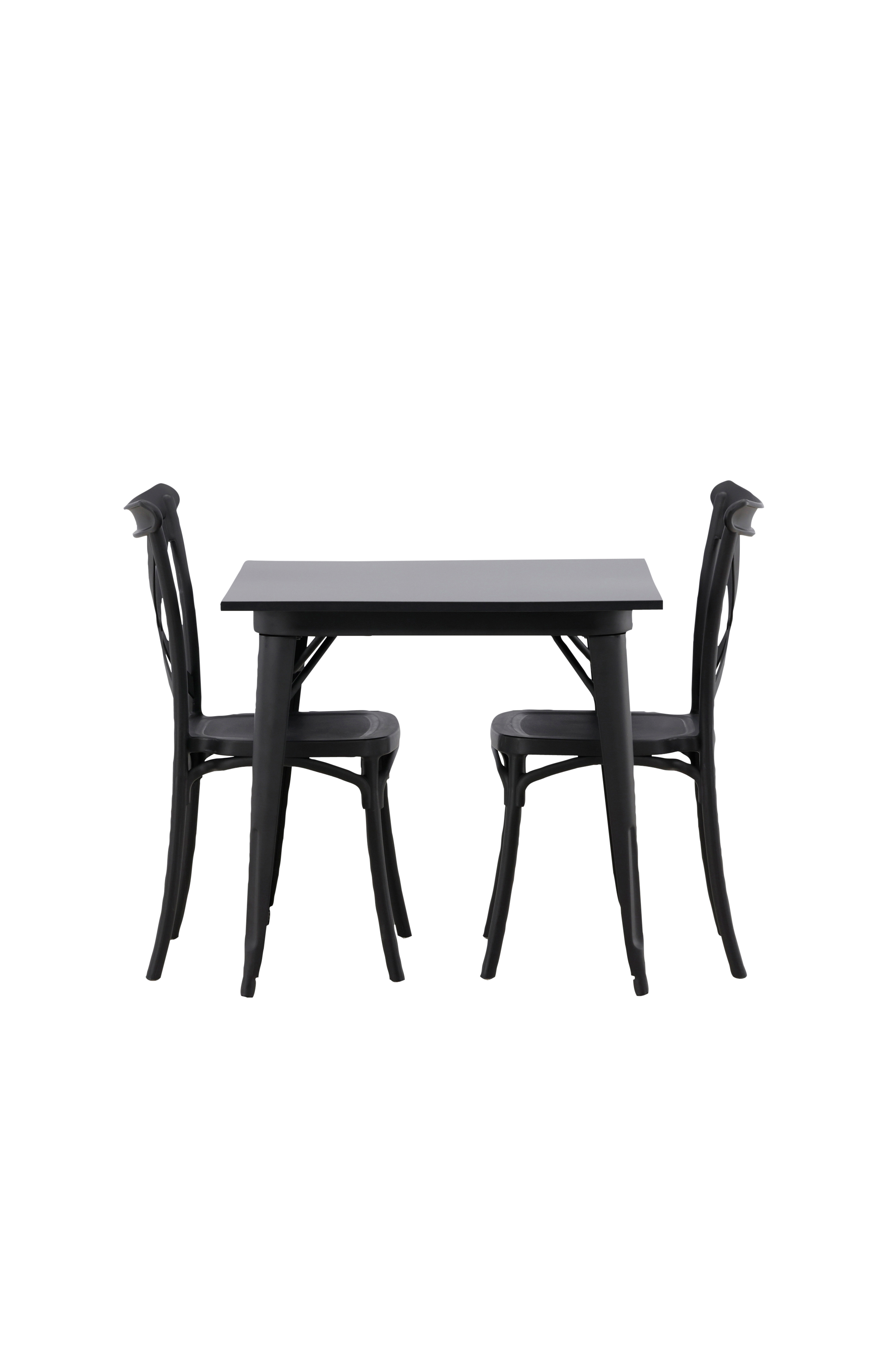 En klassisk spisegruppe for to - møbler det mindre køkken smart og stilrent! Spisebordet fra serien Tempe har en klassisk, kvadratisk udformning og en tidløs sort farve. Bordpladen er i sort MDF og bordbenene i sort metal. Her i smagfuld kombination med to spisebordsstole fra serien Crosett. Stolene har en nostalgisk udformning med kryds i ryglænet og lige linjer, gennemgående fremstillet i plast. Her får du en fin spisegruppe at pryde hjemmet med!