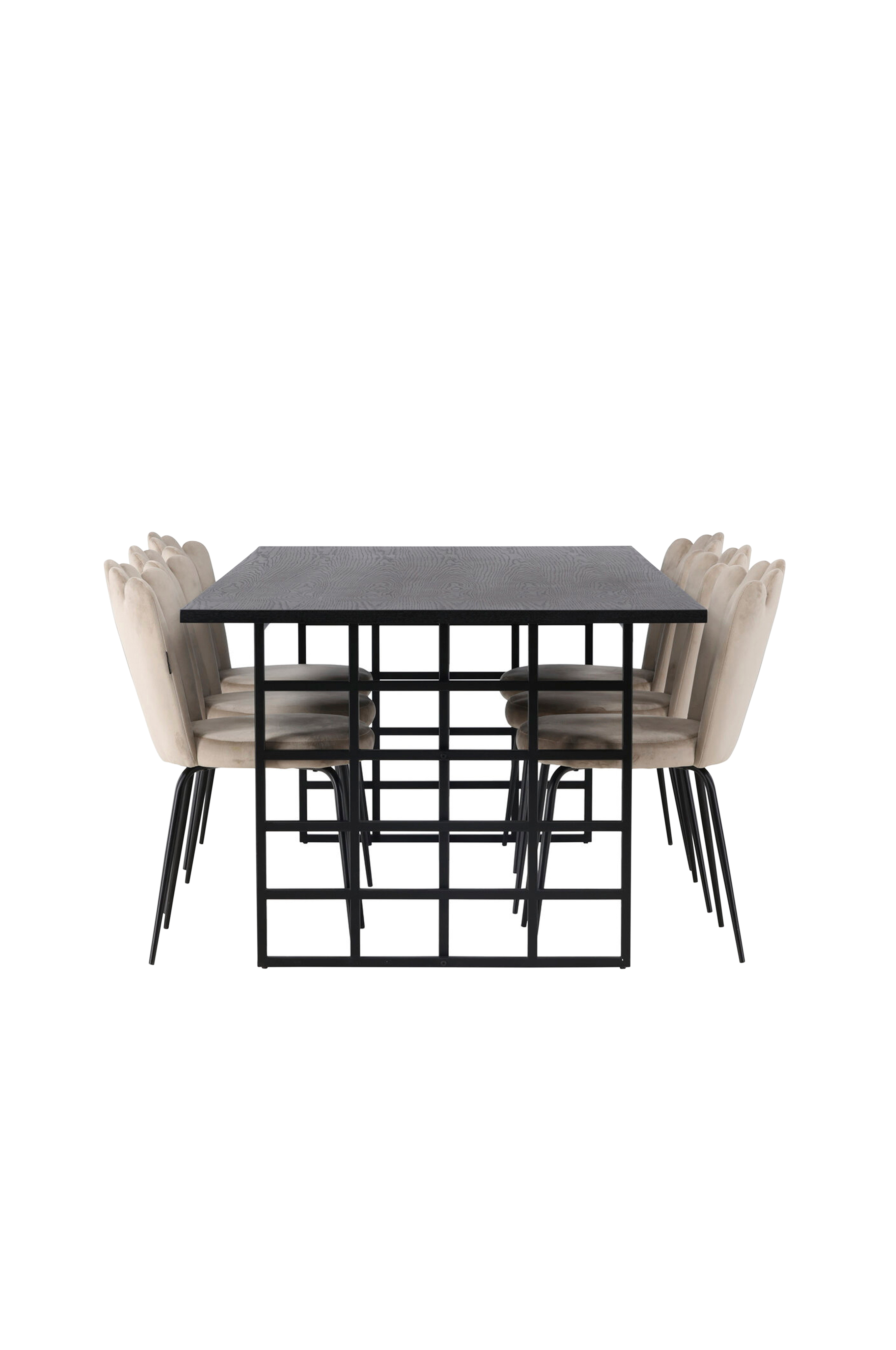 Stolebenene i pulverlakeret metal matcher bordet perfekt og skaber en ensartet harmoni i spisegruppen. Føl dig omfavnet af velourstoffets subtile luksus, mens du nyder måltider eller samvær med venner og familie omkring dette fantastiske spisebord!