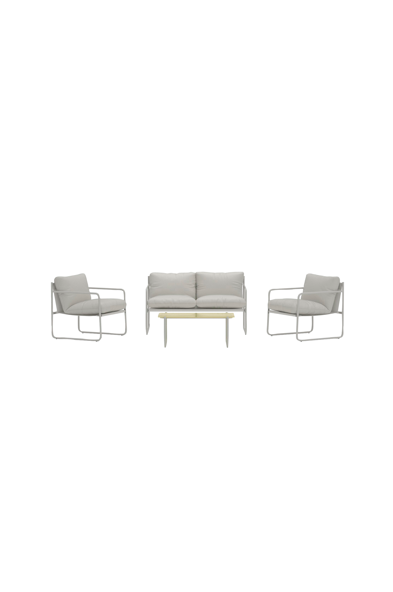 De bløde, beige hynder giver høj komfort og indbyder til lange stunder med afslapning, mens det åbne design med slanke rammer giver sættet et let og moderne look. Bordets enkle design supplerer ensemblet og giver en praktisk overflade til kaffe, drikkevarer eller dekorative genstande.