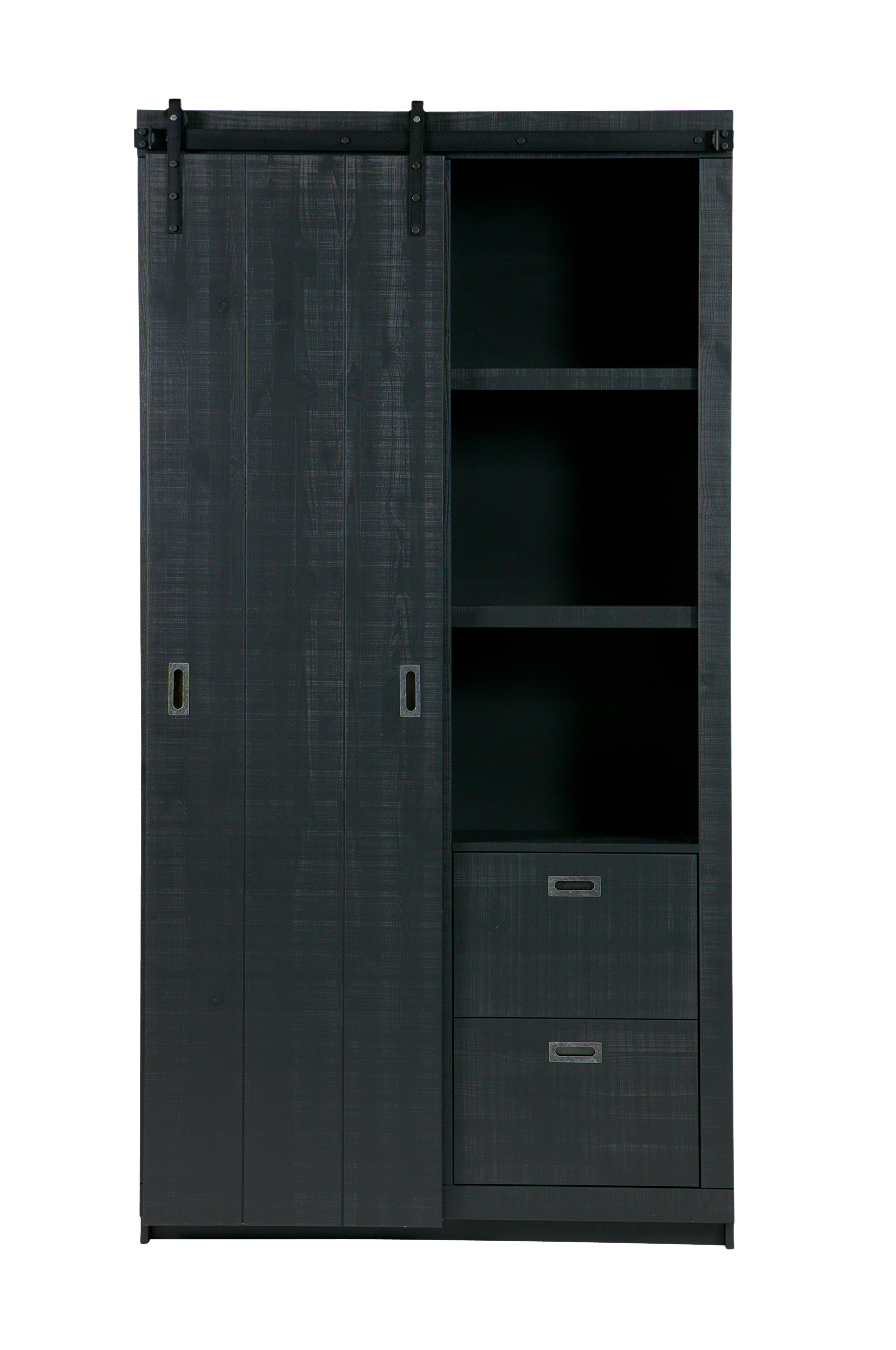 Dette garderobeskab er produceret af det hollandske brand VT wonen. Garderobeskabet har to sider - to hylder og i bunden 2 skuffer, den ene side altid synlig og den anden dækket af skydelågen. Skydelågen i metalskinne kan skydes fra højre til venstre. Skabet er fremstillet i solidt, FSC-certificeret fyrretræ med grov finish.