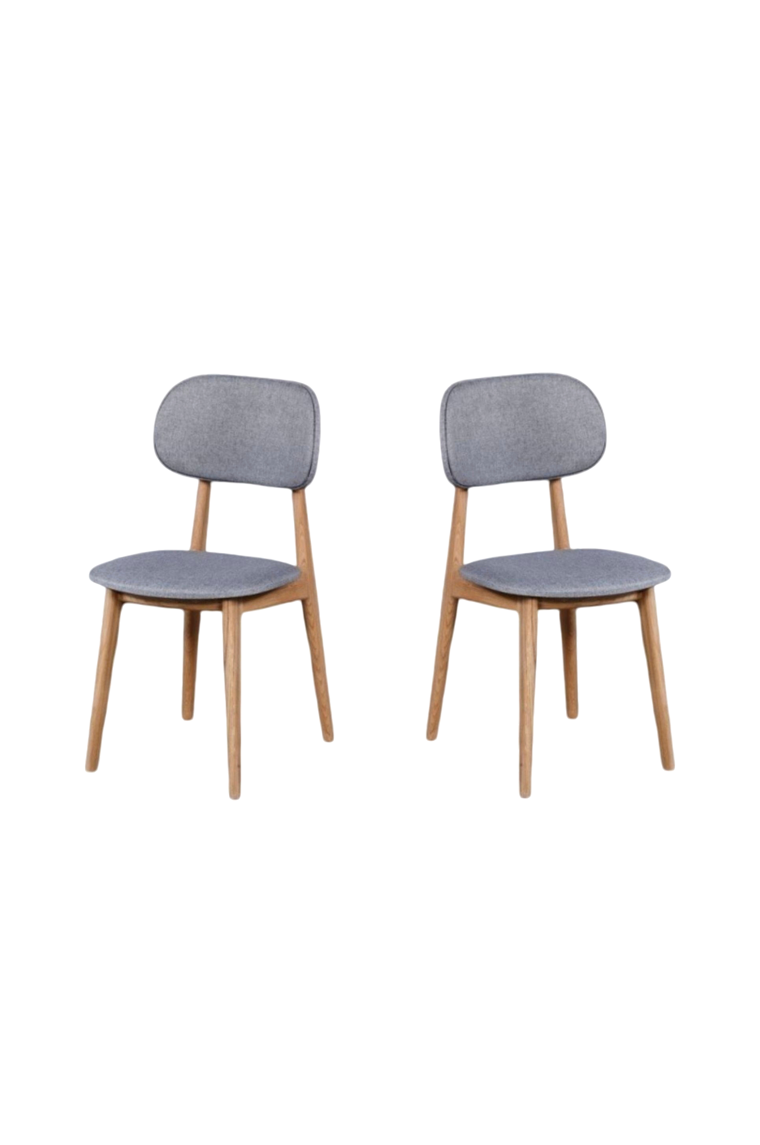 Stilfuldt sæt med to stole. Polstrede stole i lysegråt stof. Skandinavisk design, høj kvalitet, fremstillet af massivt egetræ og krydsfiner, samlet på fabrikken. Maksimal belastning 110 kg.