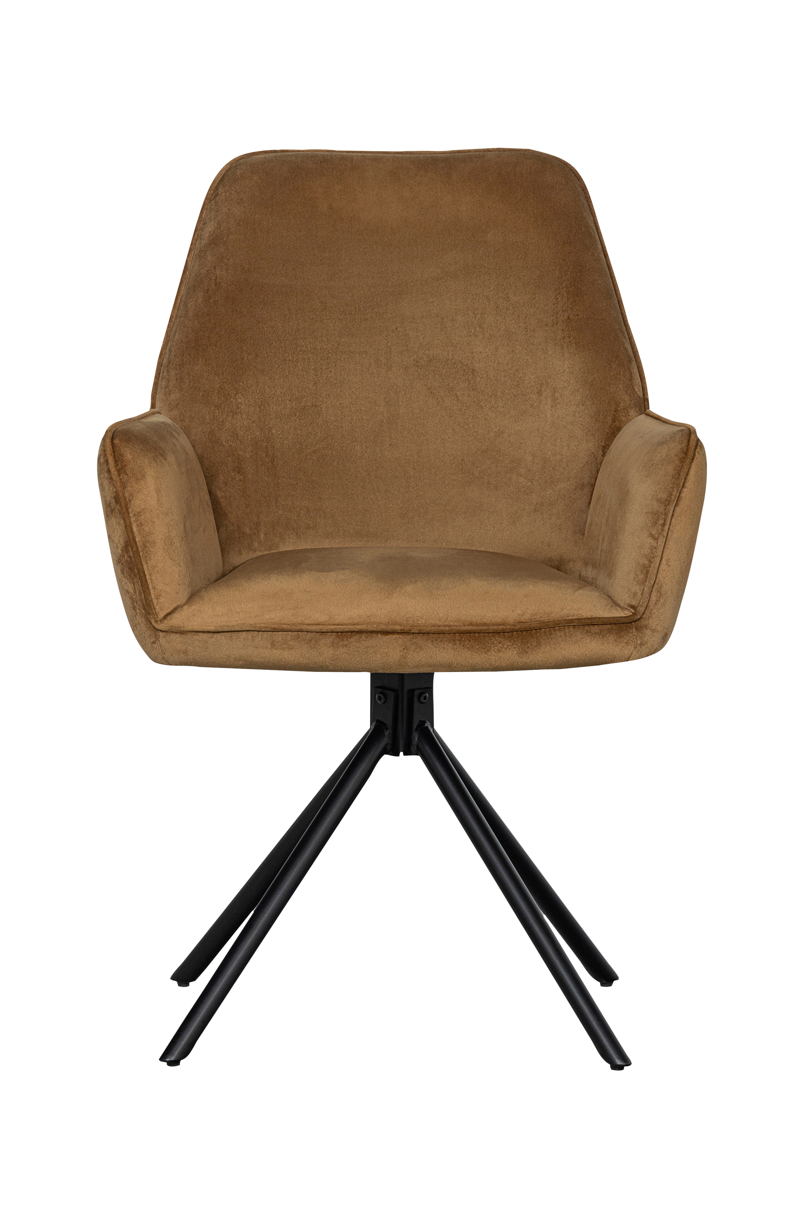 Spisebordsstolen Amber fra en eksklusiv kollektion fra det hollandske brand WOOOD. Ryglænet og sædet er betrukket med velourstof af 100% polyester, med Martindale-værdi 20.000.