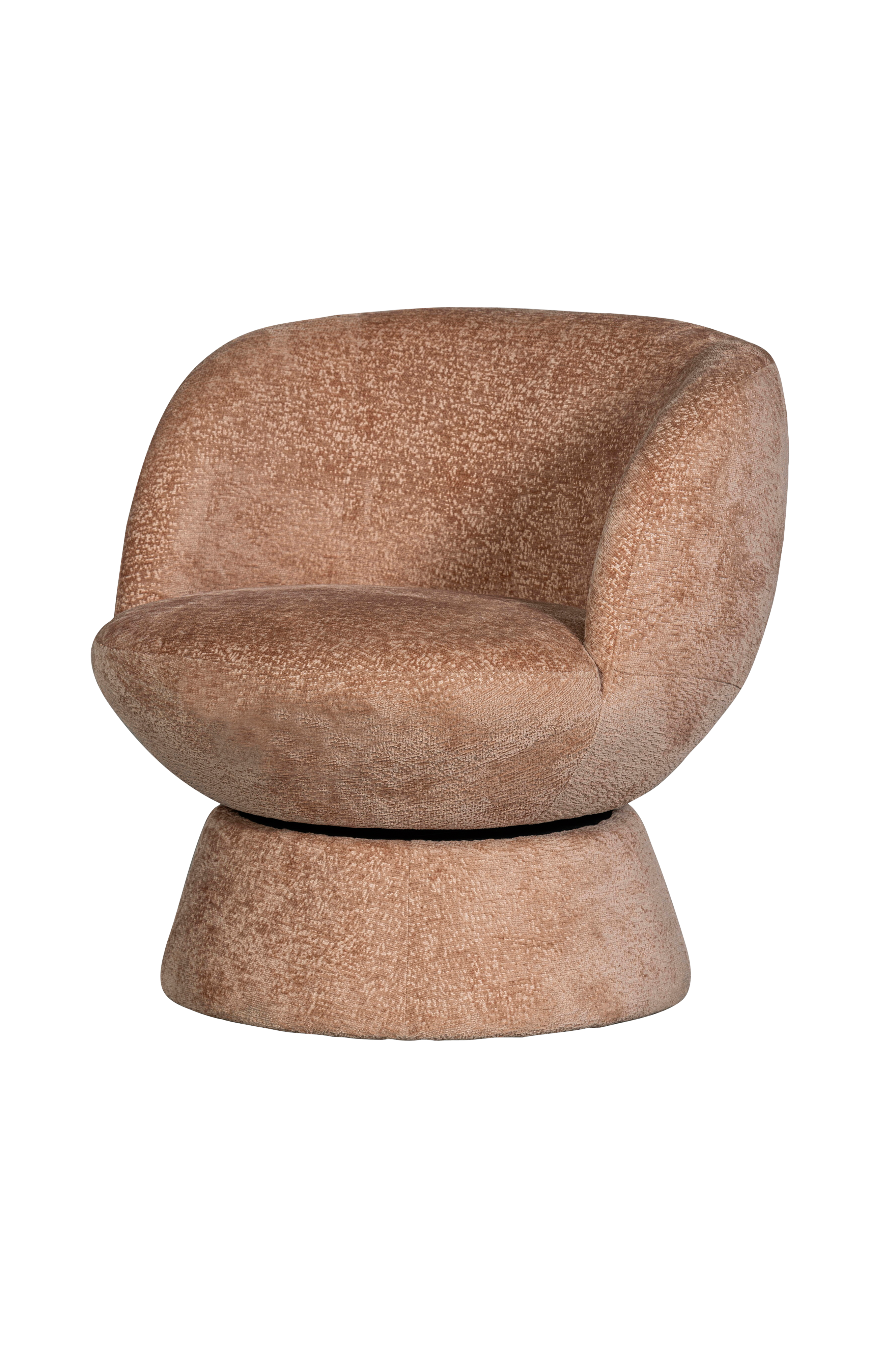 shuffle-drejestolen kommer fra det hollandske mærke bepurehomes kollektion og har et venligt, blødt udseende. Sædet og basen danner en timeglasfigur og er dækket fra top til tå med et groft vævet stof med luksuriøs lysreflektion.
