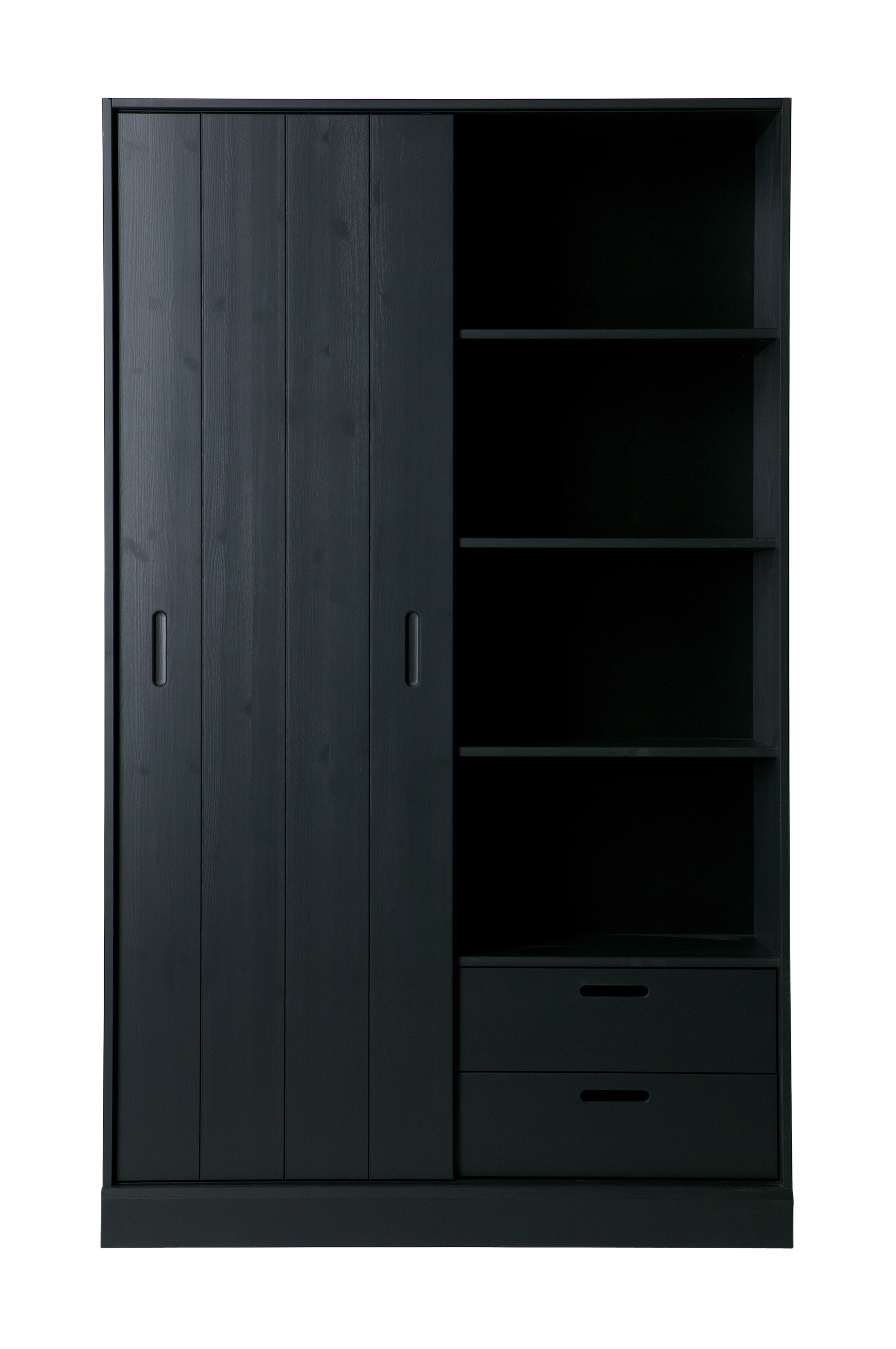 Et rummeligt skab med et trendy look og masser af opbevaringsplads. Træet har en slebet finish som giver skabet et ekstra råt udseende. Skabet har en bredde på 120 cm og har 9 store opbevaringsrum samt en praktisk skydelåge. Skydelågen sparer plads og gør det muligt at skjule nogle rum. I højre side af skabet er der yderligere to skuffer længst nede. Du kan vælge om du vil køre skydelågen hen foran skufferne eller om du vil kunne se de fine skuffer. Et skab som dette passer perfekt ind i et moderne interiør.