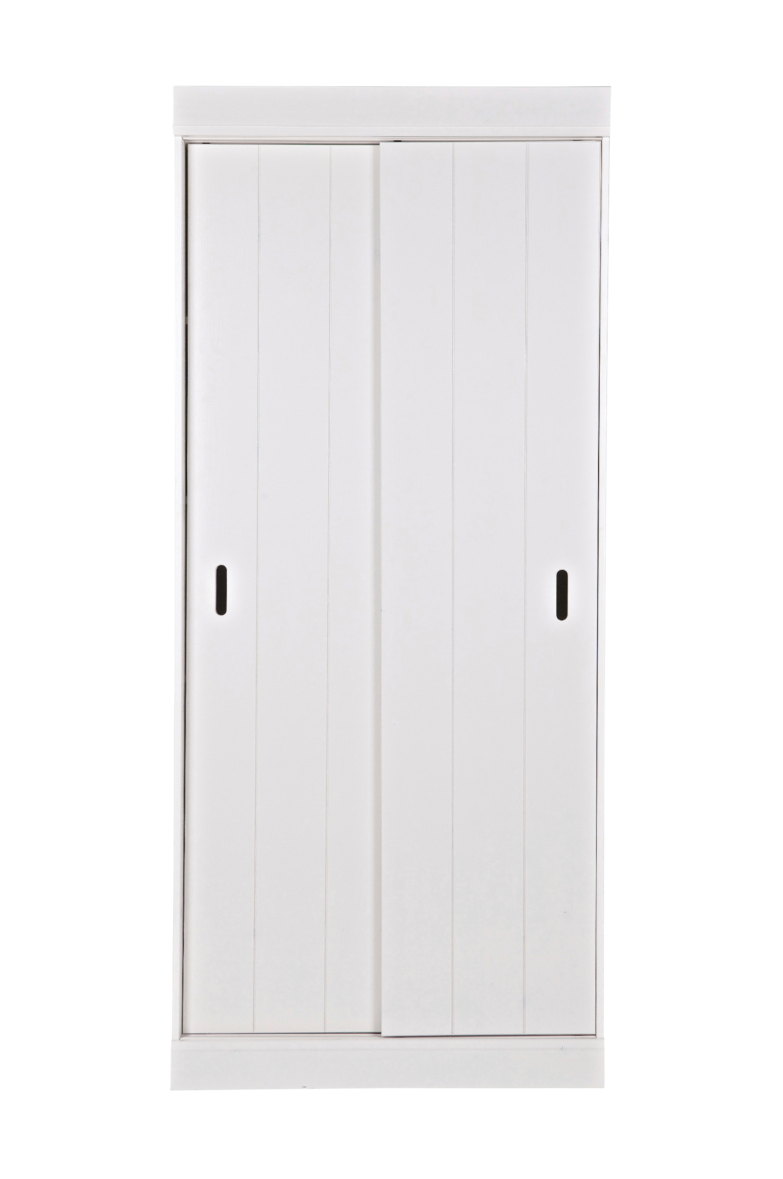 Row er et trendy garderobeskab med masser af hylder. Garderobeskabet har to skydelåger i kombination med en tæt sokkel. Fordelen ved dette garderobeskab er at det er let at placere, også hvis der ikke er så meget plads, takket være skydedørene. Dette garderobeskab er fremstillet i massivt fyrretræ og MDF-lag med melamin.