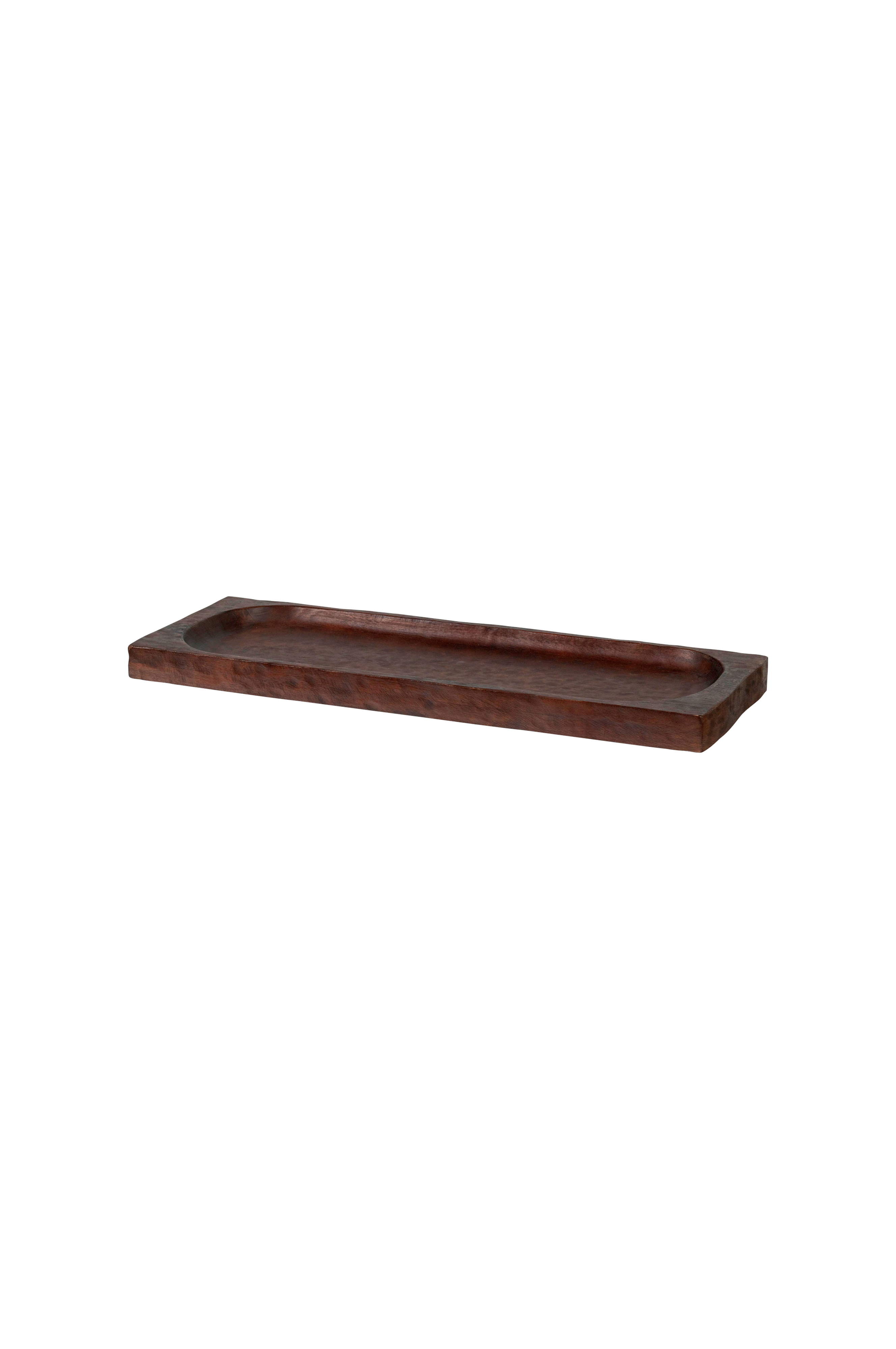 Denne rektangulære bakke tilfører øjeblikkeligt et strejf af luksus til dit interiør. Den er fremstillet af mangotræ og har en dyb, varm brun farve, der udstråler klasse og kvalitet. Den fordybede inderside gør den ideel til stilfuld præsentation af snacks, drikkevarer eller dekorative genstande. Uanset om du bruger den som en praktisk serveringsløsning eller som en dekorativ bakke på dit bord, skænk eller køkkenbord.