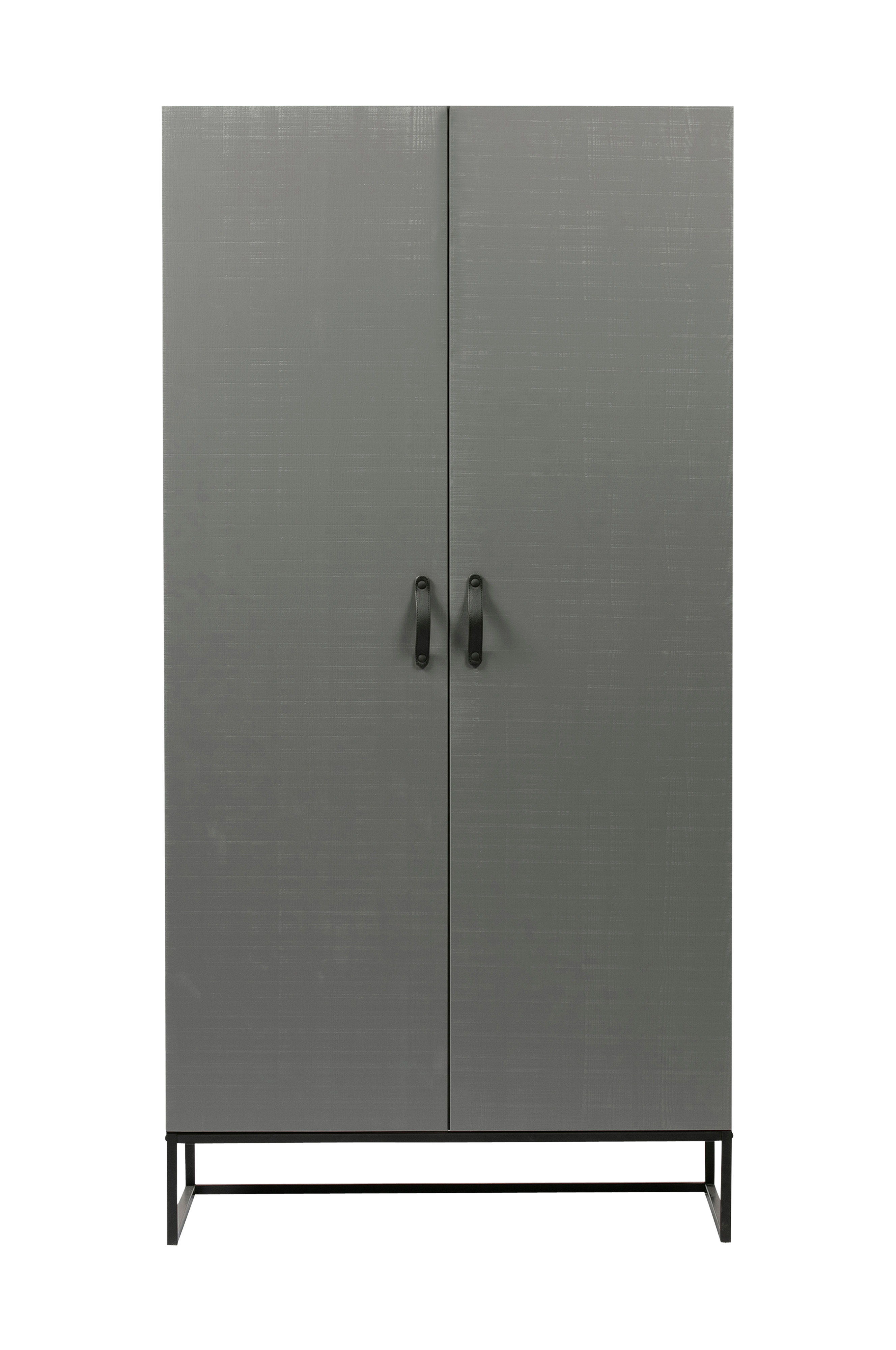 Dette solide FSC-certificerede klædeskab har en rustik, malet overflade og lågerne har læderhåndtag. Understellet er af lakeret metal. Indretningen i skabet er af melamin og består af en bred hylde øverst og en delt stang under til venstre, samt tre delte hylder til højre.
