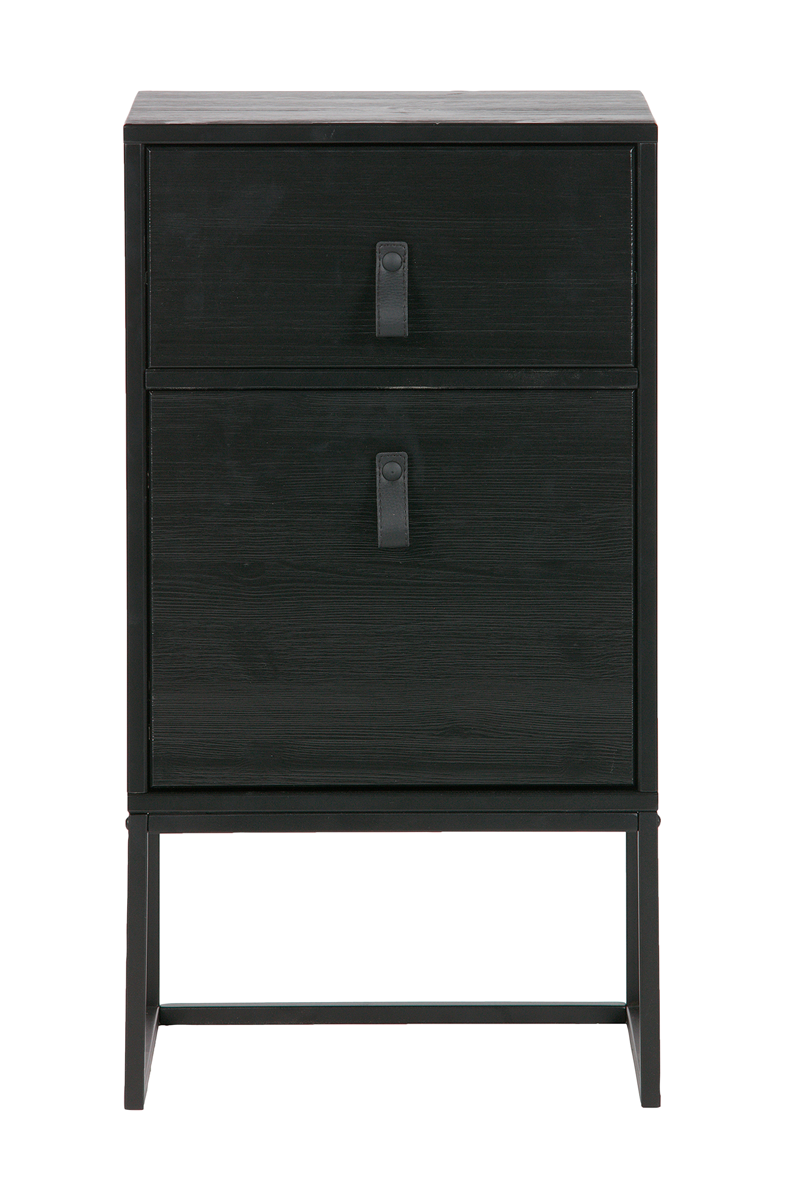 Sengebord Zola med skuffe og låge er en del af WOOOD-kollektionen og passer ind i ethvert soveværelse. Det moderne sengebord er fremstillet af metal og fyrretræ. Både metal og træ i sort finish.