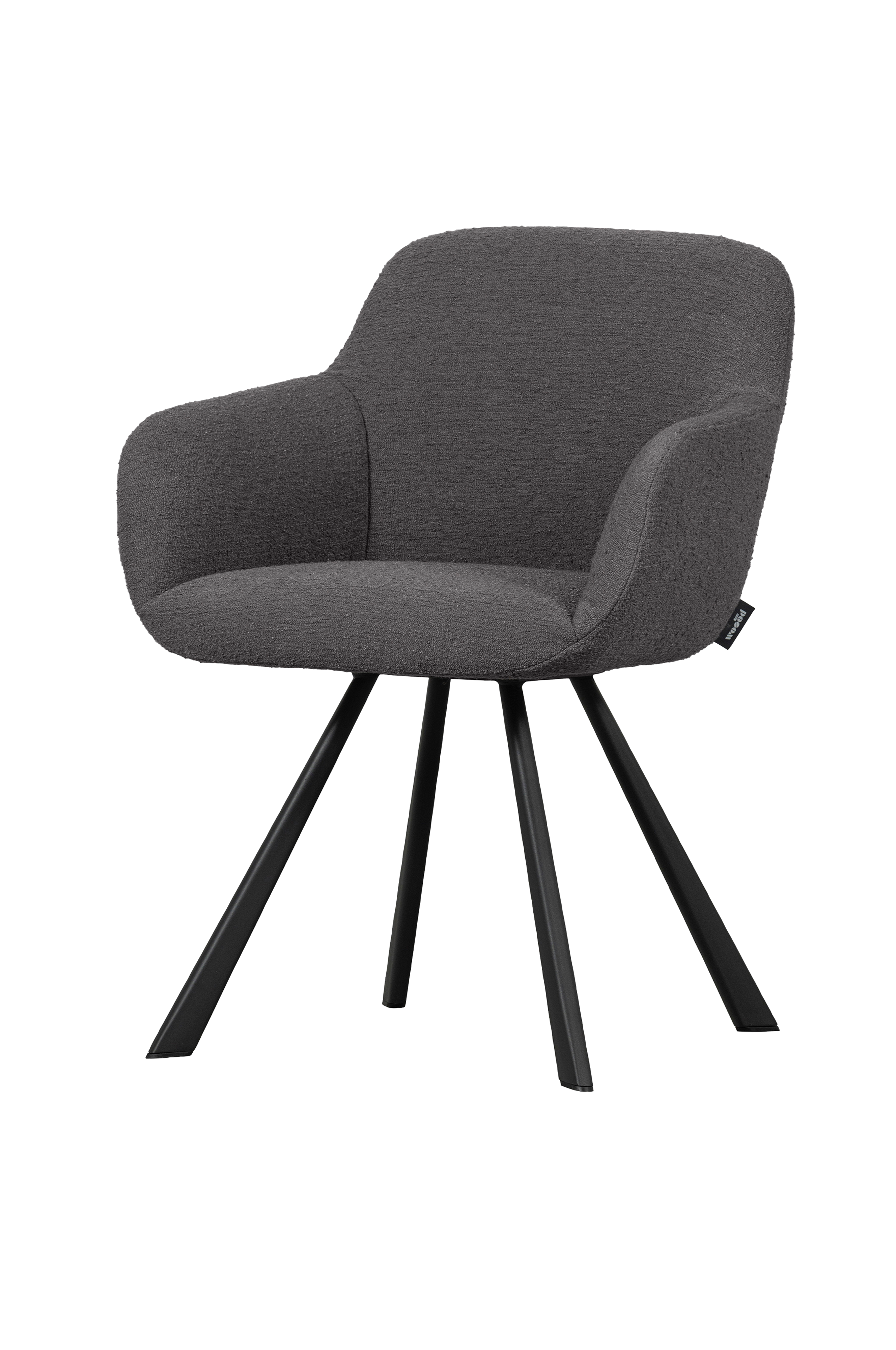 Juno spisebordsstol har metalben med matsort pulverlackering. Sædet er lavet af et stel af stål og krydsfiner, beklædt med PU-skum. Sædet er betrukket med et uldent boucléstof. Det bløde boucléstof har en elegant tekstur, der straks giver dit hjem en varm følelse. Den tætte vævning gør stoffet meget slidstærkt og gør at boucléstoffet ikke slides så let. Alle farver har også en høj farveægthed, men beskyt stoffet mod direkte sollys for at undgå farvenuancer.