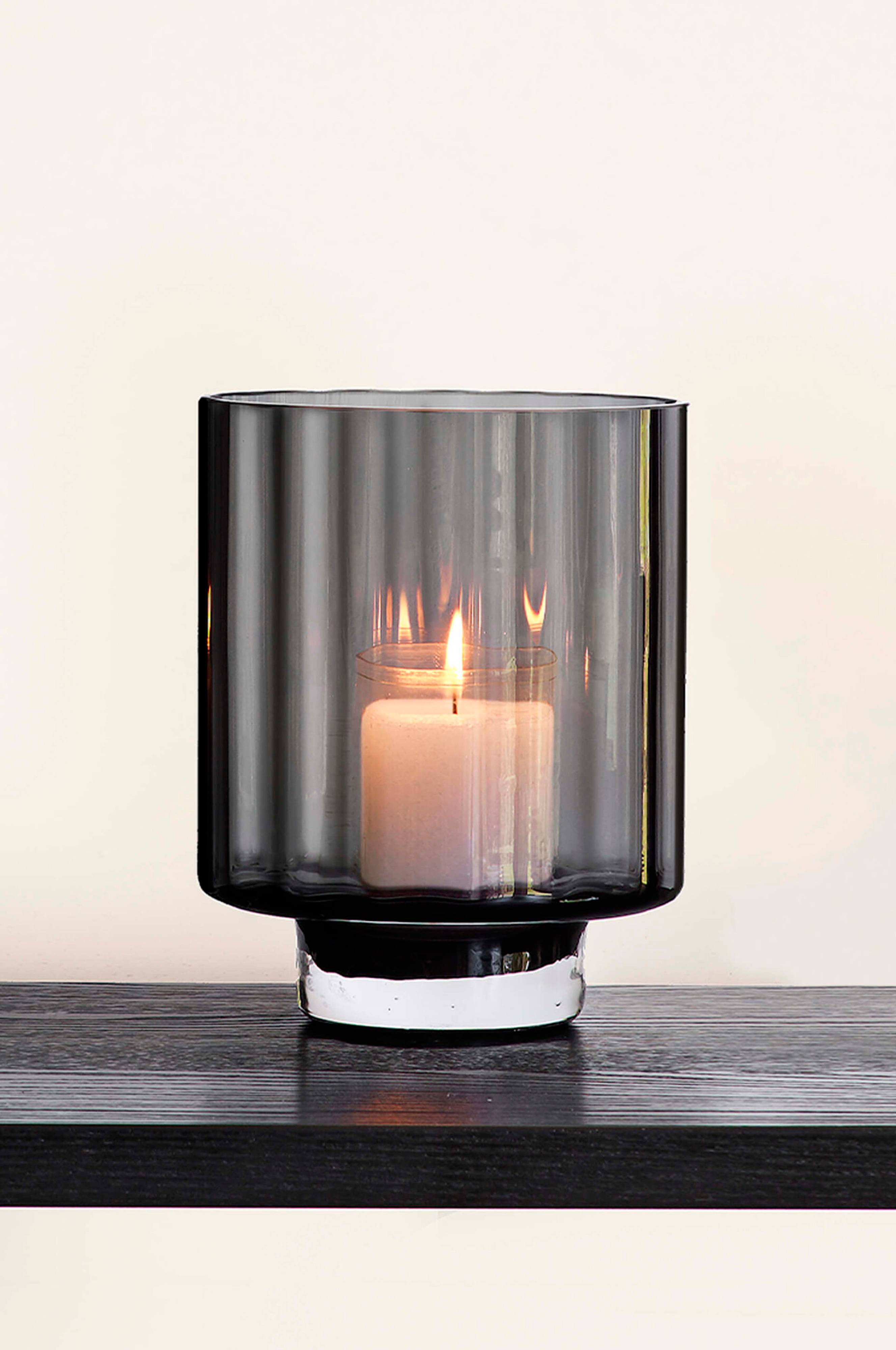 Unikt smuk, håndlavet lanterne i røgfarvet glas. Kan også bruges som mindre vase. Sæt to pænt sammen eller match med den flotte Optic vase. Højde 15 cm, Ø 12 cm.