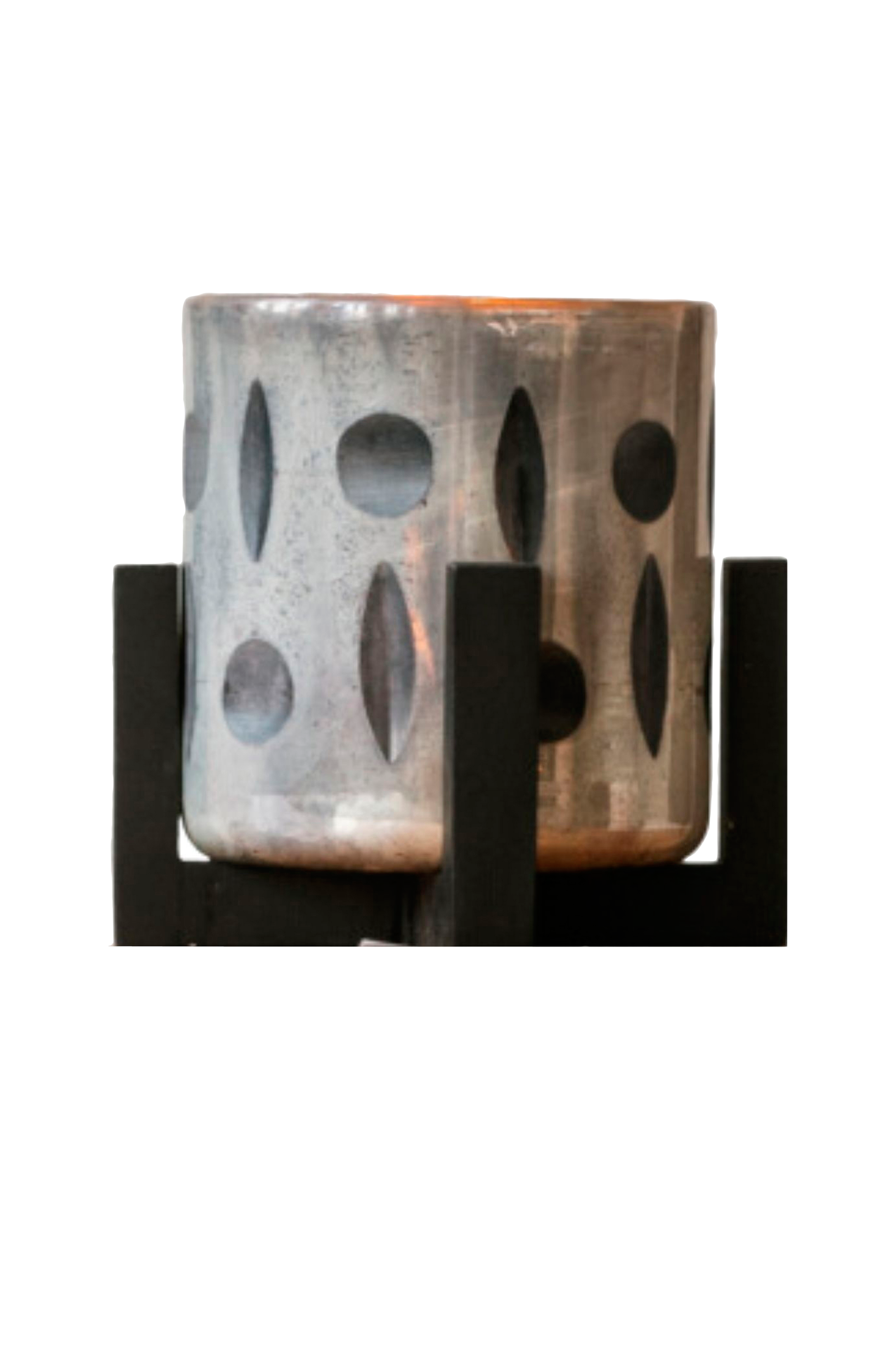 Smuk lysestage i kunstglas i en håndlavet træfod. Giver et varmt og hyggeligt skær.