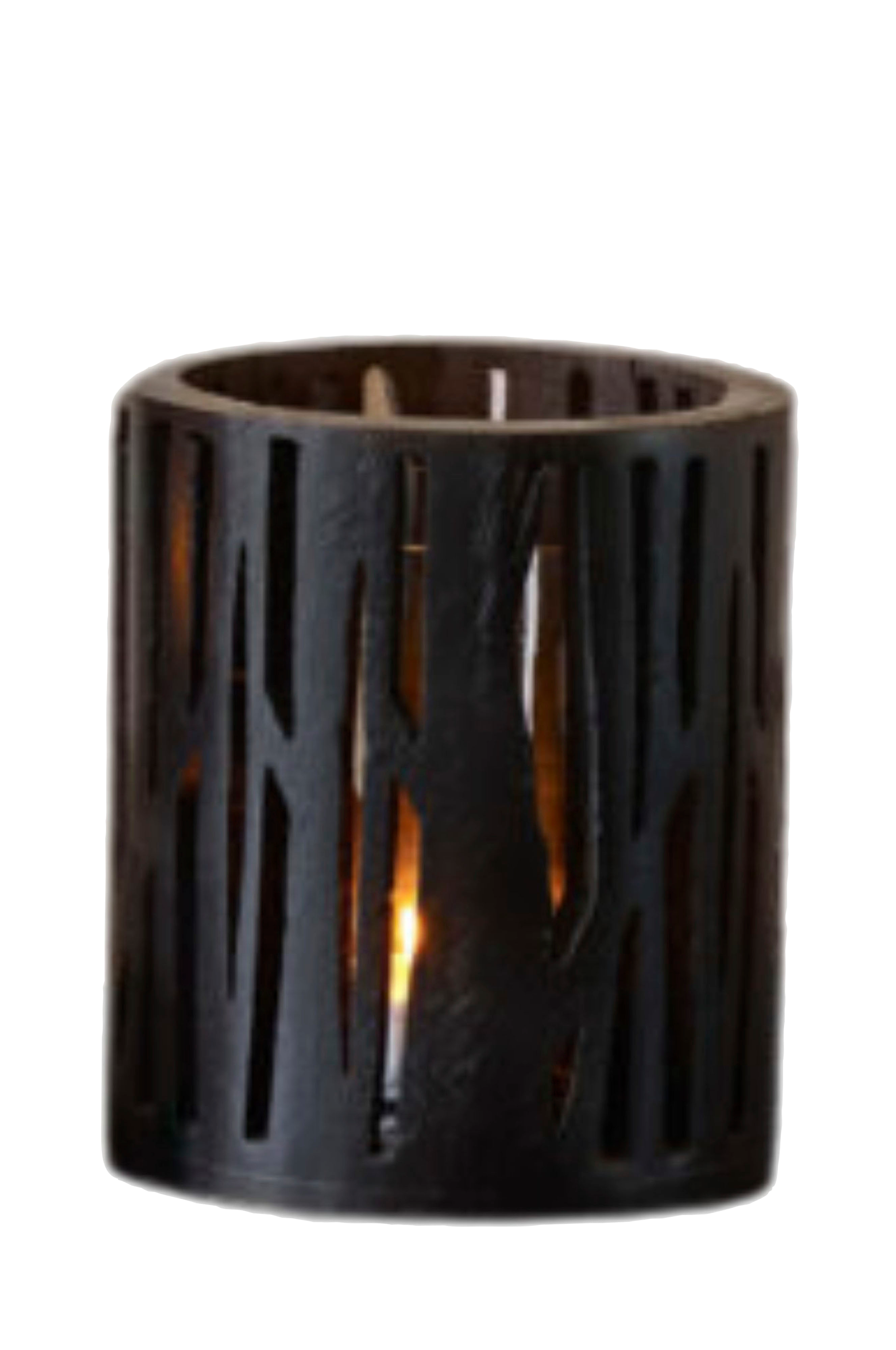 Lyslygte eller krukke i sort træ. Glasset i lanternen giver et elegant skiftende lys. Virkelig hyggeligt!