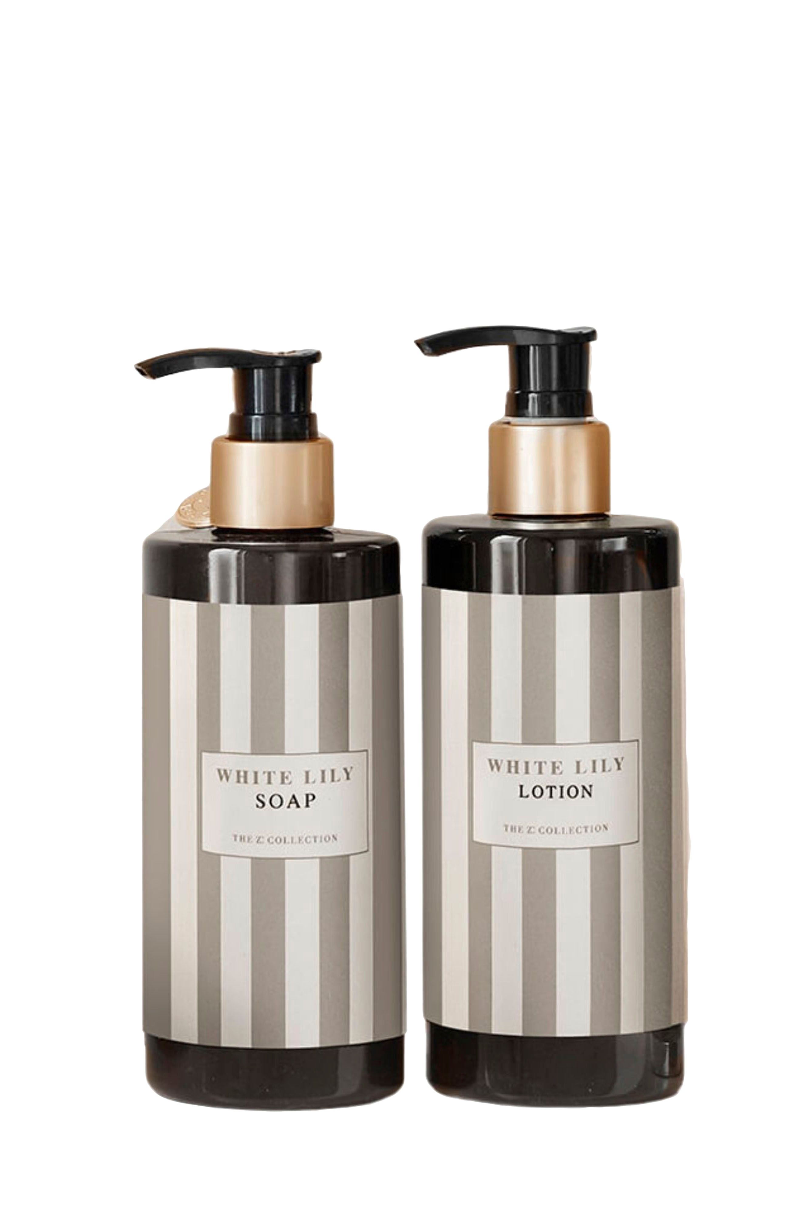 Sæbe og lotion med skøn blomstret duft af hvide liljer. Pakket i flotte plastflasker, der er gode at genbruge.