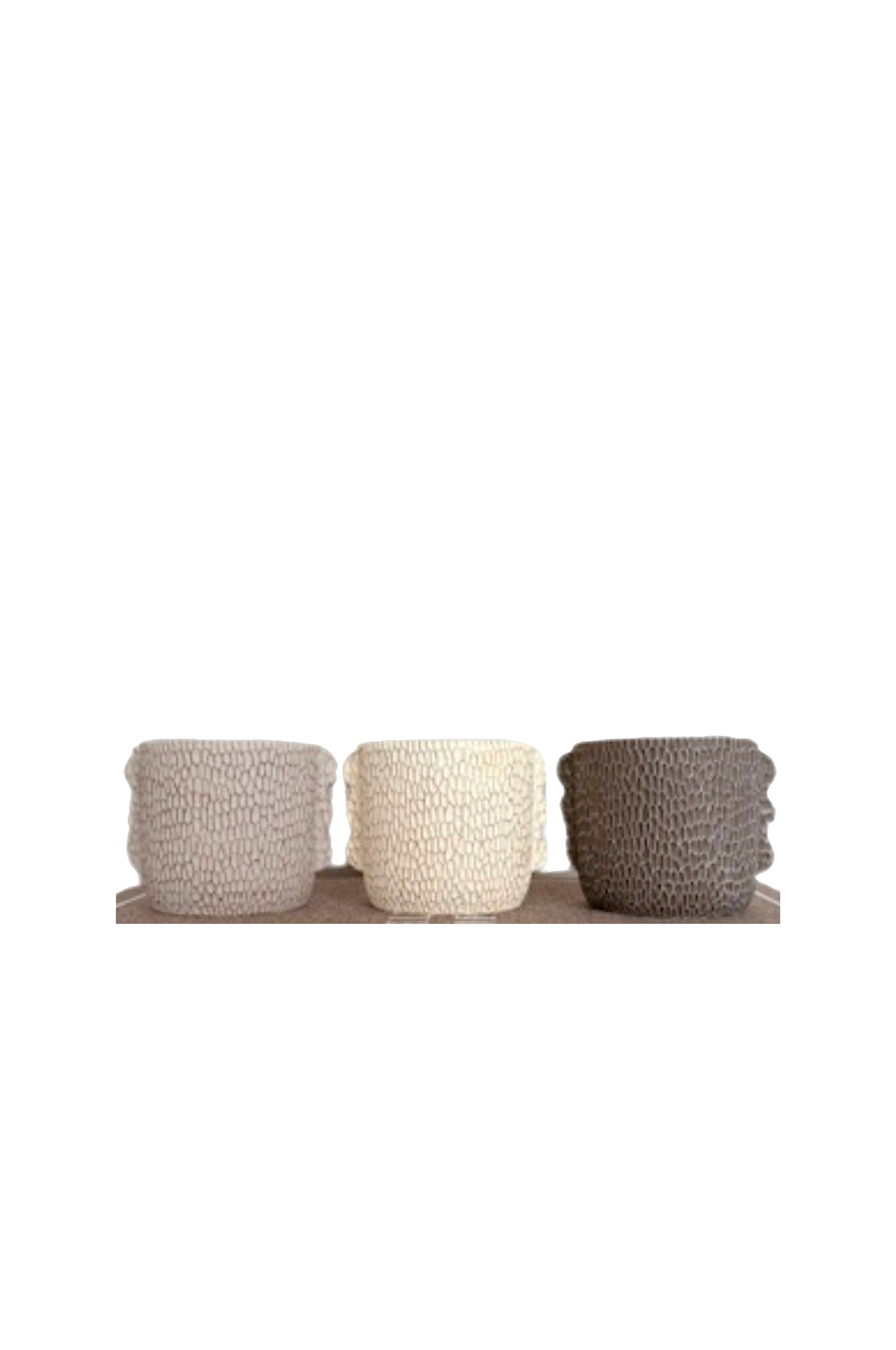 Sæt med tre keramiske skåle med en sandet overflade fyldt med voks. Brændetid ca. 20 timer.