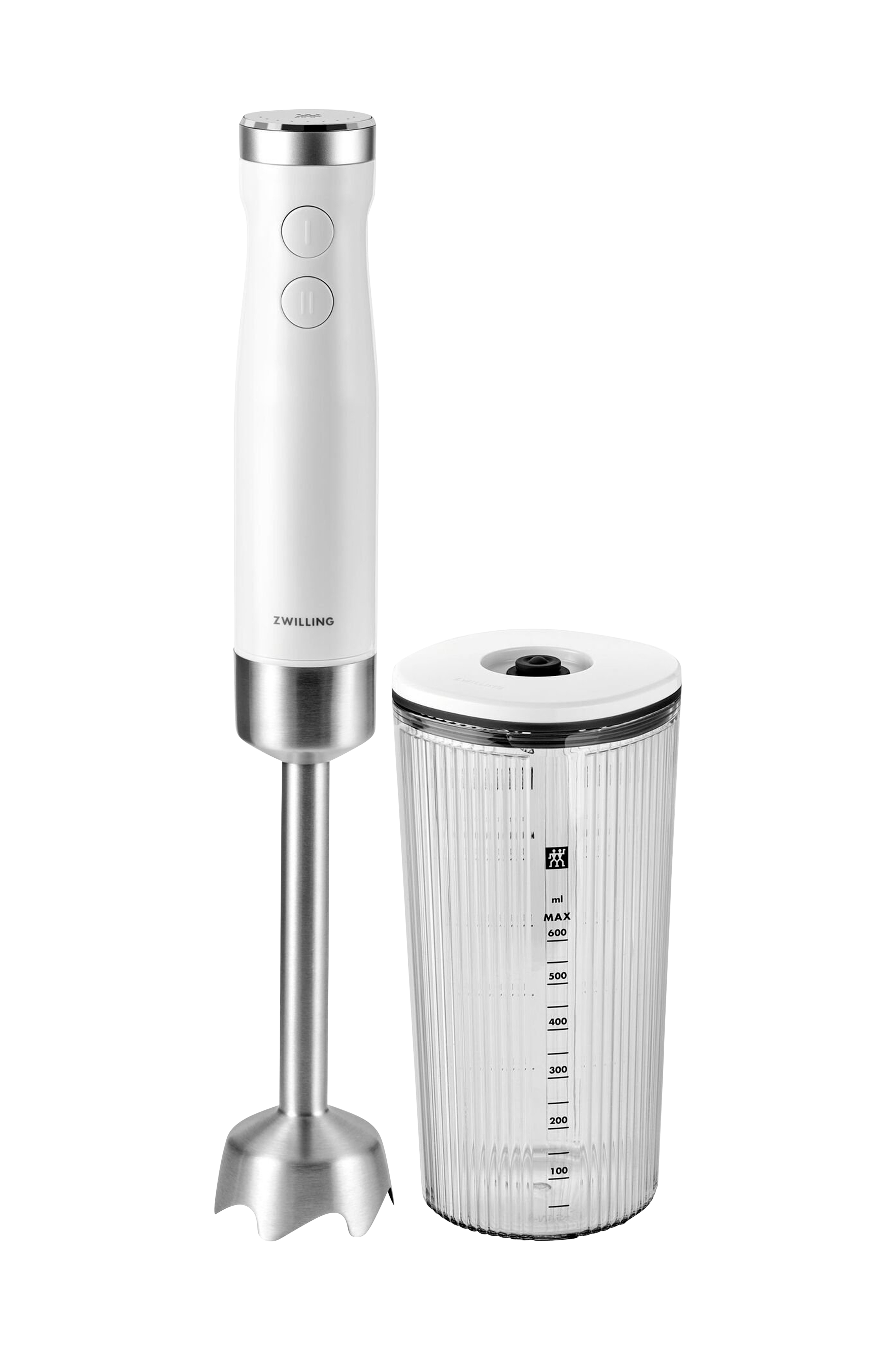 Det skarpe Zwilling Winglet-blad med "piranha-tænder" sikrer de fineste blenderesultater. Det klokkeformede skaft forbedrer håndteringen og er mere ergonomisk. Den fungerer perfekt sammen med den medfølgende blenderkande eller direkte i gryden. Kanden på 600 ml er lavet af BPA-fri plast og leveres med et låg, der er kompatibelt med vores vakuumpumpe. Du kan f.eks. tilberede saucer om morgenen, vakuumforsegle dem og nyde dem friske om aftenen, eller forberede ingredienser dagen før og blot blende dem, når det er tid til aftensmad.