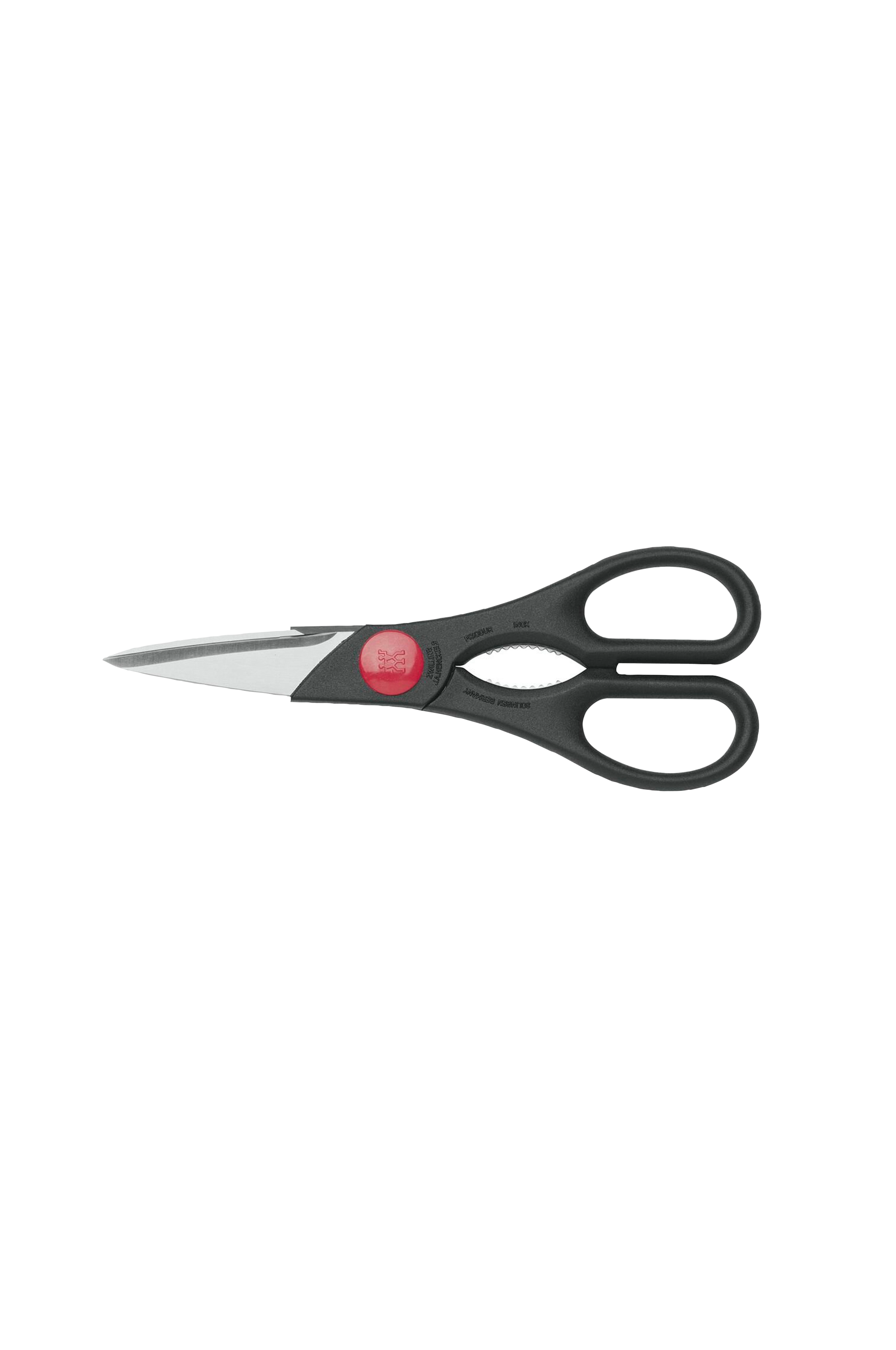 En skarp saks med mange anvendelsesmuligheder er et must i ethvert køkken. Denne universalsaks fra Zwilling er let i hånden og klipper uden problemer både tynde og tykke materialer takket være de robuste, håndslebne sakseblade i rustfrit stål, der er hærdet med en speciel metode. Mikrotænderne fikserer det, der skal klippes optimalt. Den integrerede åbner hjælper dig med at f.eks. løsne stramme skruelåg. Ved hjælp af den røde fastgørelsesskrue med Zwilling-logoet kan du justere saksebladene, hvis det er nødvendigt.